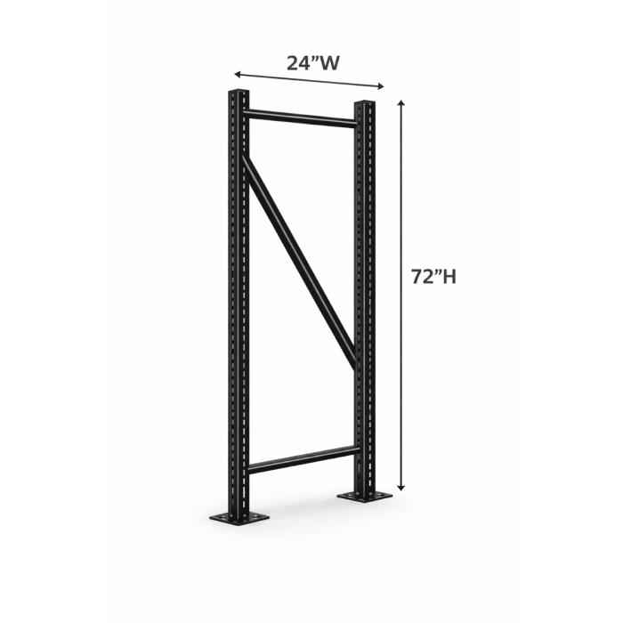 With a 24” depth and 72” height, this upright frame pairs with wide span beams and decking to create strong, open shelving bays ideal for cartons, bulk items, and order picking operations.